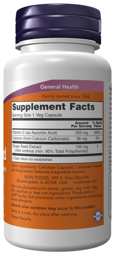 Экстракт виноградных косточек от Now - это высококонцентрированный экстракт, содержащий как минимум 90% полифенолов, в том числе олигомерные проантоцианидины (OPC), полезные водорастворимые сложные соединения, которые нейтрализуют свободные радикалы. В природном виде они содержатся в виноградных косточках. В результате целого ряда исследований было обнаружено, что экстракт виноградных косточек и OPC могут поддерживать здоровье сердечно-сосудистой системы, костей, почек, мозга и других тканей организма. Кроме того, они обеспечивают здоровую и сбалансированную реакцию иммунной системы на окислительный и метаболический стрессы. Витамин C был добавлен из-за его антиоксидантного потенциала.