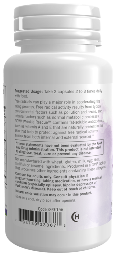 Капсулы от морщин американского бренда NOW Foods - ваши главные союзники в сражении за сияющую красоту, здоровье и молодость дермы. БАД позволит вернуть коже упругость и эластичность, разгладить и предотвратить появление заломов и признаков старения, нормализовать выработку естественного коллагена и водный баланс. Капсулы Wrinkle Rescue также выравнивают цвет и рельеф лица, снимают воспаления, сужают поры и регулируют физиологические механизмы. Эффективным действием средство обязано своему составу - в нём присутствуют соединения и витамины молодости кожи растительного происхождения. Формула БАДа в каждой капсуле представлена такими компонентами: