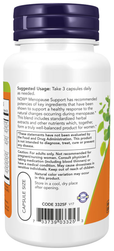 Now Menopause Support содержит рекомендуемые концентрации ключевых ингредиентов, которые, как было показано, поддерживают здоровый ответ на естественные изменения, происходящие во время менопаузы. В состав этой смеси входят стандартизированные экстракты трав и другие питательные вещества, которые вместе образуют по-настоящему сбалансированный продукт для женщин.