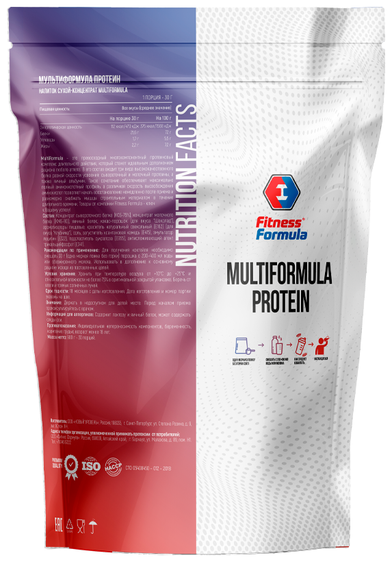 Multiformula Protein - это высококачественный протеин, который способен поддерживать пиковую концентрацию аминокислот в крови на протяжении 4 часов. В каждой его порции содержится свыше 21 грамма протеиновой матрицы, представленной молочным и сывороточным белками, а также яичным альбумином. Никакой сои или глютена в составе. Только отборное сырье, прошедшее многоуровневую очистку от бесполезных жиров и углеводов.