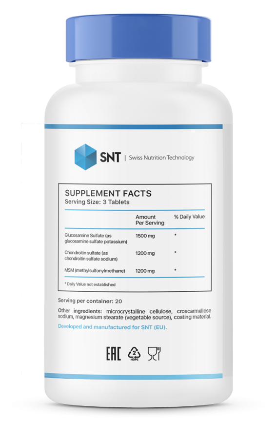 SNT Glucosamine Chondroitin MSM биологически активная добавка к пище, созданная для профилактики и лечения заболеваний опорно-двигательного аппарата. Прием препарата способствует сохранению и восстановлению структурной целостности суставов и соединительных тканей. Снижается риск получения травм на спортивных занятиях, увеличивается подвижность суставов. SNT Glucosamine Chondroitin MSM уменьшает воспалительные процессы, боль в суставах, способствует ускорению восстановления хрящевой ткани после травм.