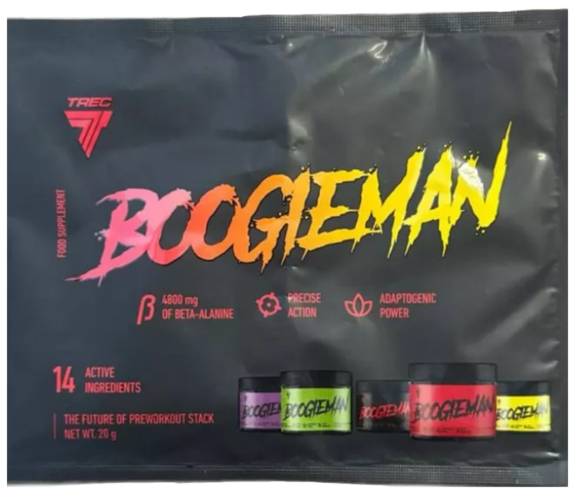 Boogieman от Trec Nutrition - это эффективный предтренировочный комплекс как для профессиональных спортсменов, так и для любителей. В нем нет агрессивных психостимуляторов, допинга, герани или эфедрина. С этим продуктом Вы забудете о дрожании рук, чувстве разбитости и проблемах с желудком.