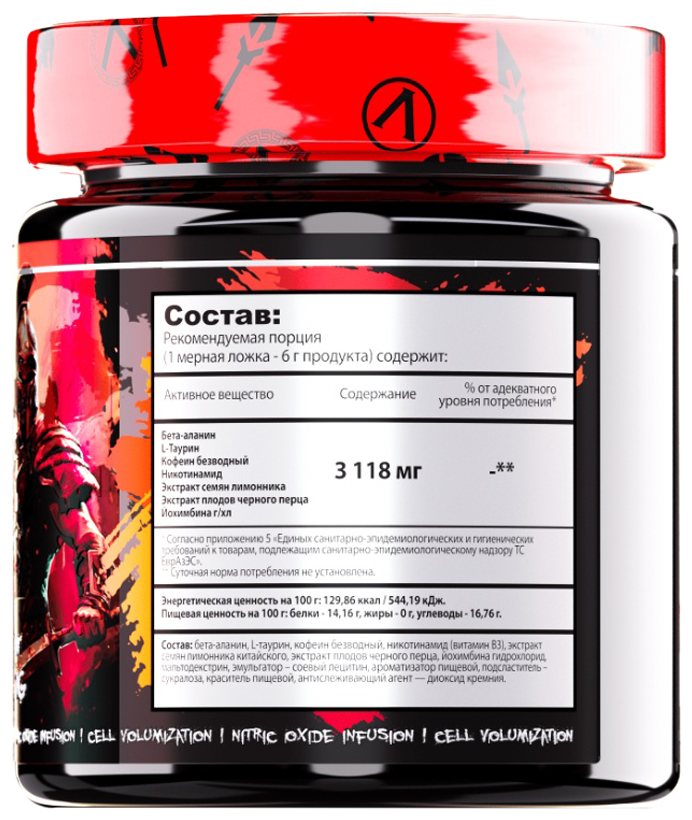 бета-аланин, L-таурин, Кофеин безводный, Экстракт семян зелёного кофе, Экстракт корня когтя дьявола, L-теанин, Никотинамид (агент B3), Экстракт семян лимонника китайского, Экстракт плодов чёрного перца, Йохимбина гидрохлорид, Пиридоксина гидрохлорид (витамин B6), Мальтодекстрин, Эмульгатор - соевый лецитин, Ароматизатор пищевой, Подсластитель - сукралоза, Краситель пищевой, Антислеживающий агент - диоксид кремния.