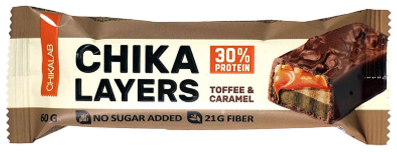 Пятислойные батончики от Chikalab Chika Layers - это ароматный слой из густой карамели и орехов в сочетании со слоями протеина и пралине, батончик покрыт нежным молочным шоколадом без сахара.